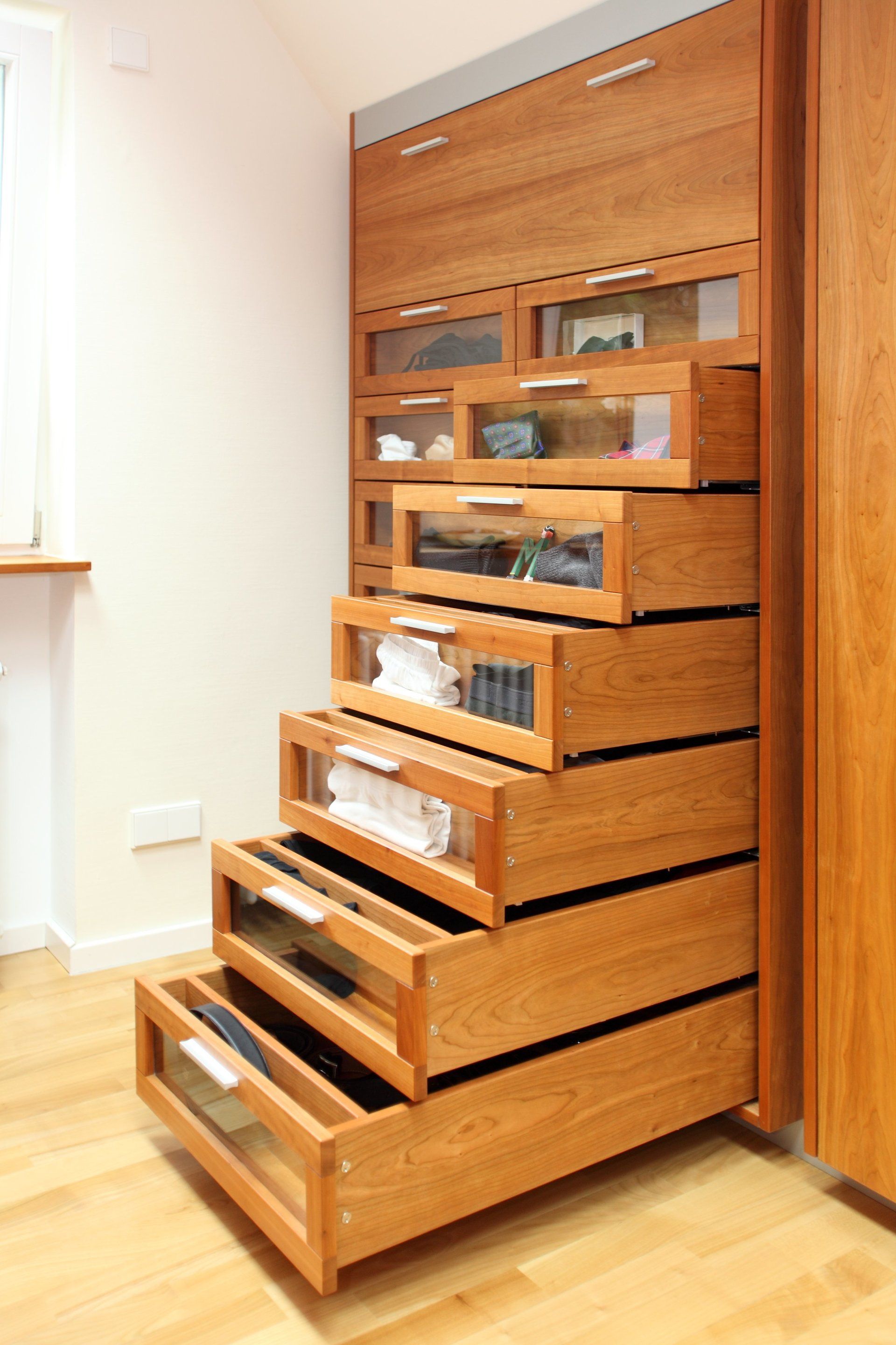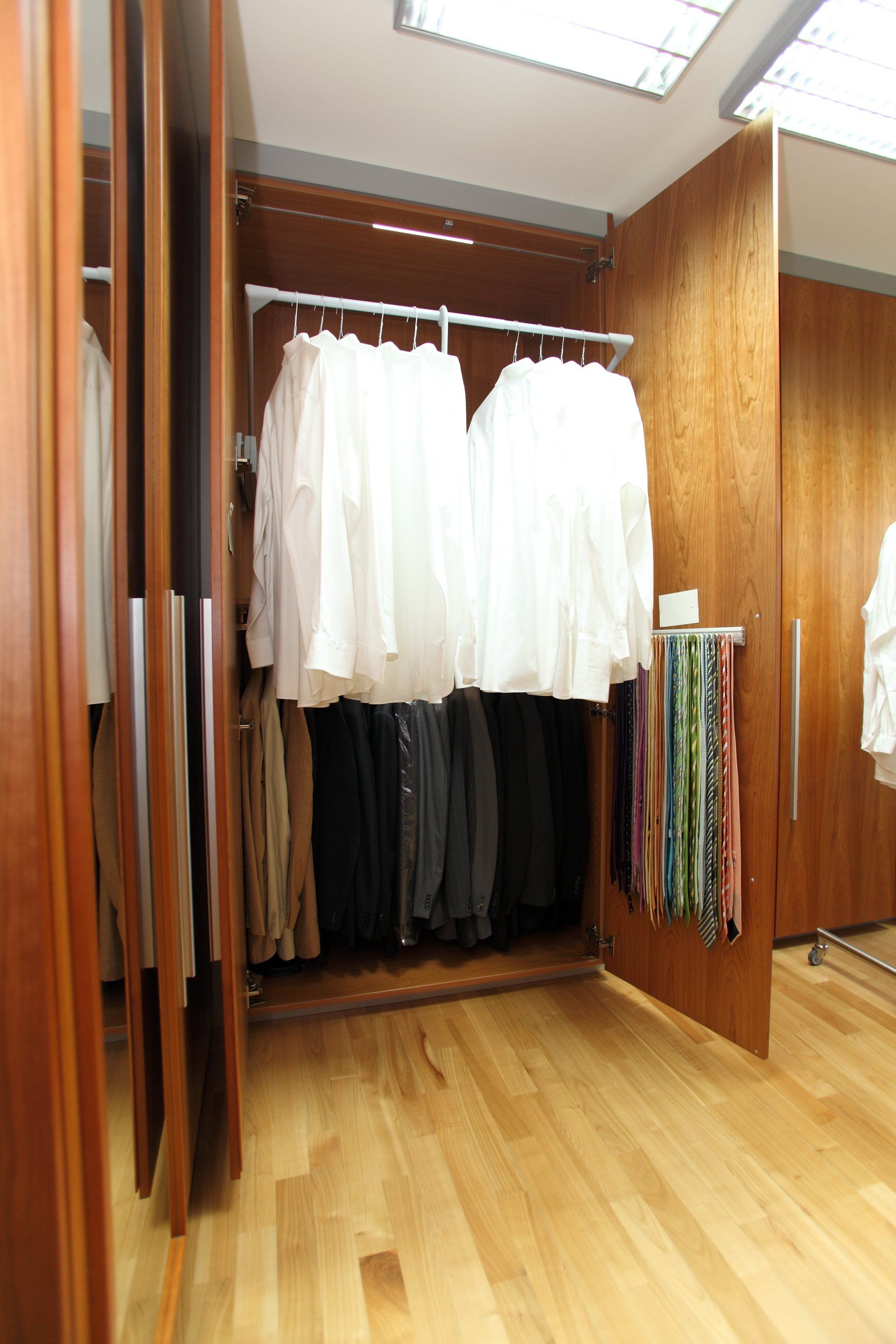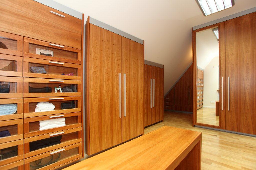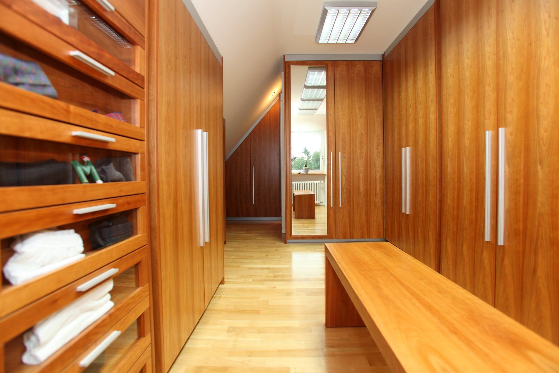 Einbauschränke in Dachschräge eingepasst, Schubladen in unterschiedlichen Tiefen zur optimalen Ausnutzung des Kniestocks. Kleiderschränke mit Kleiderlift ausgestattet und mit LED-Innenbeleuchtung durch Türkontaktschalter ausgelöst.