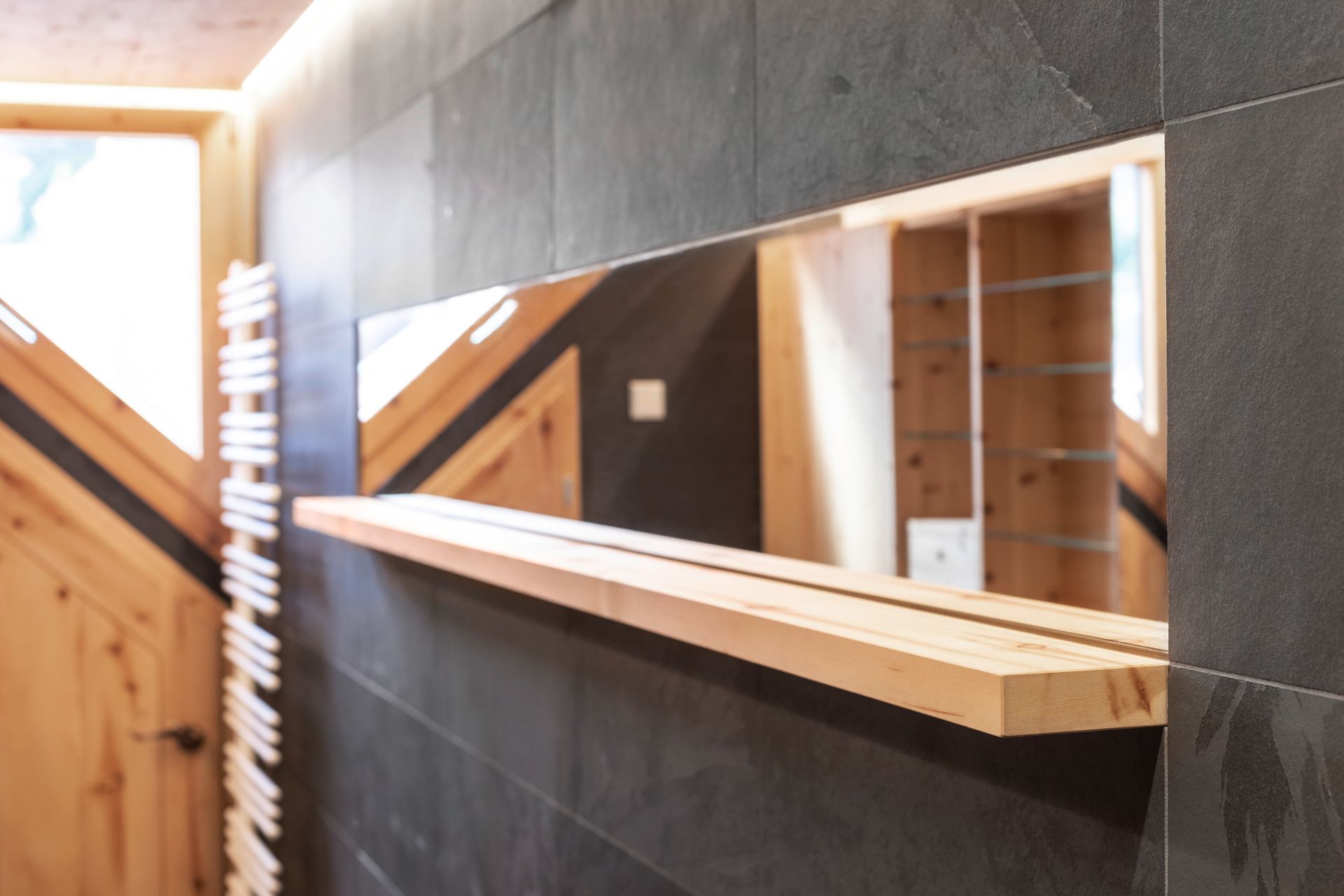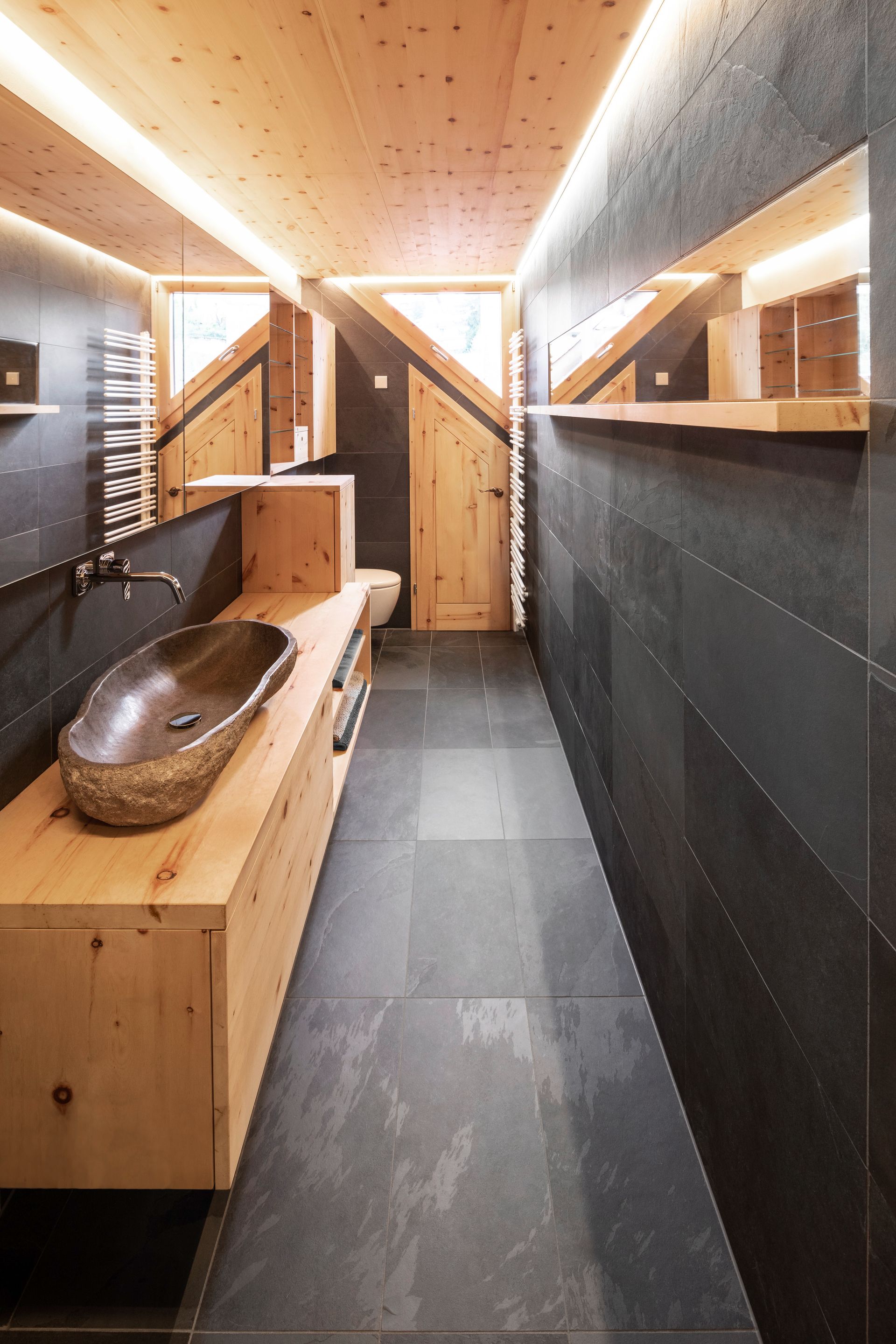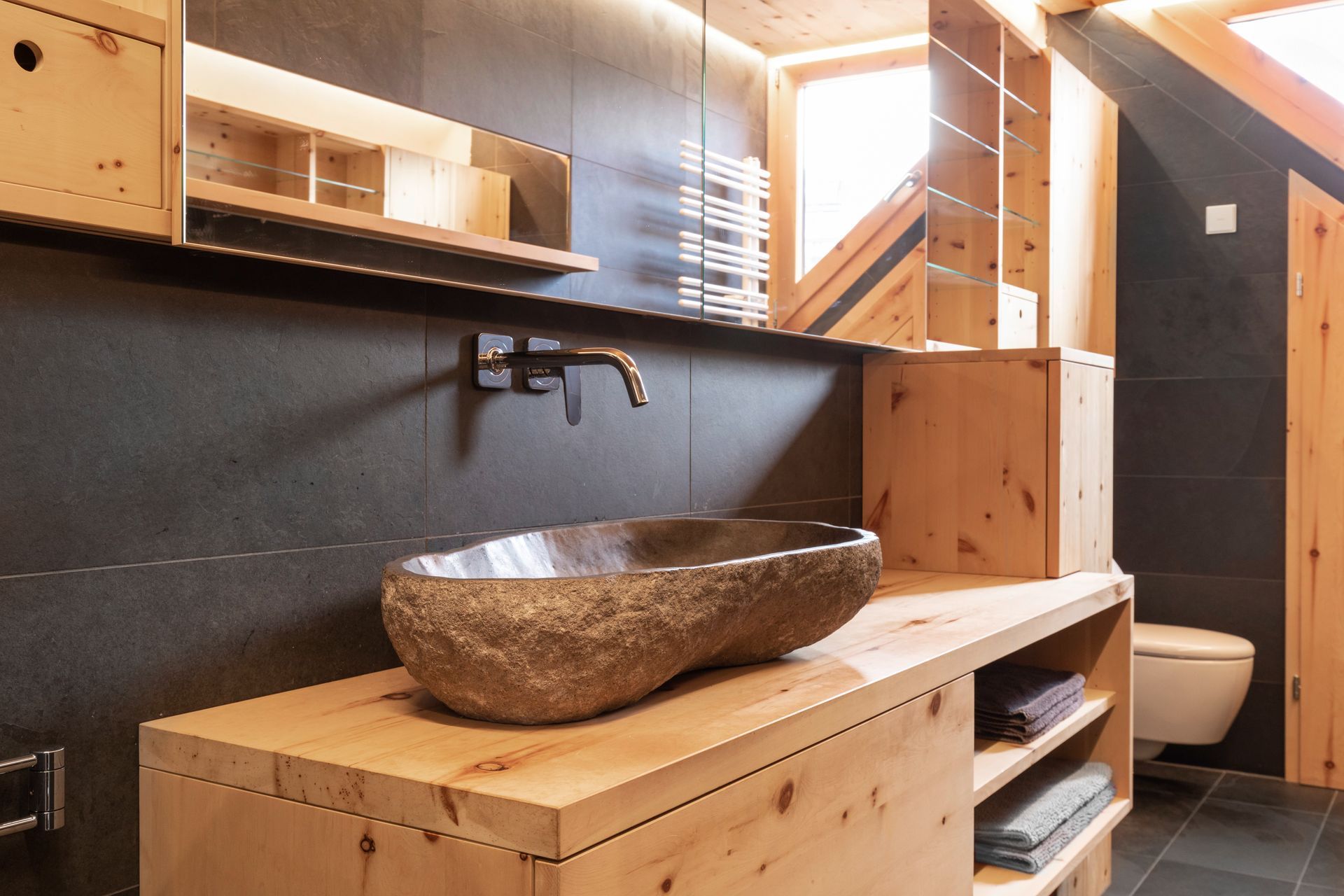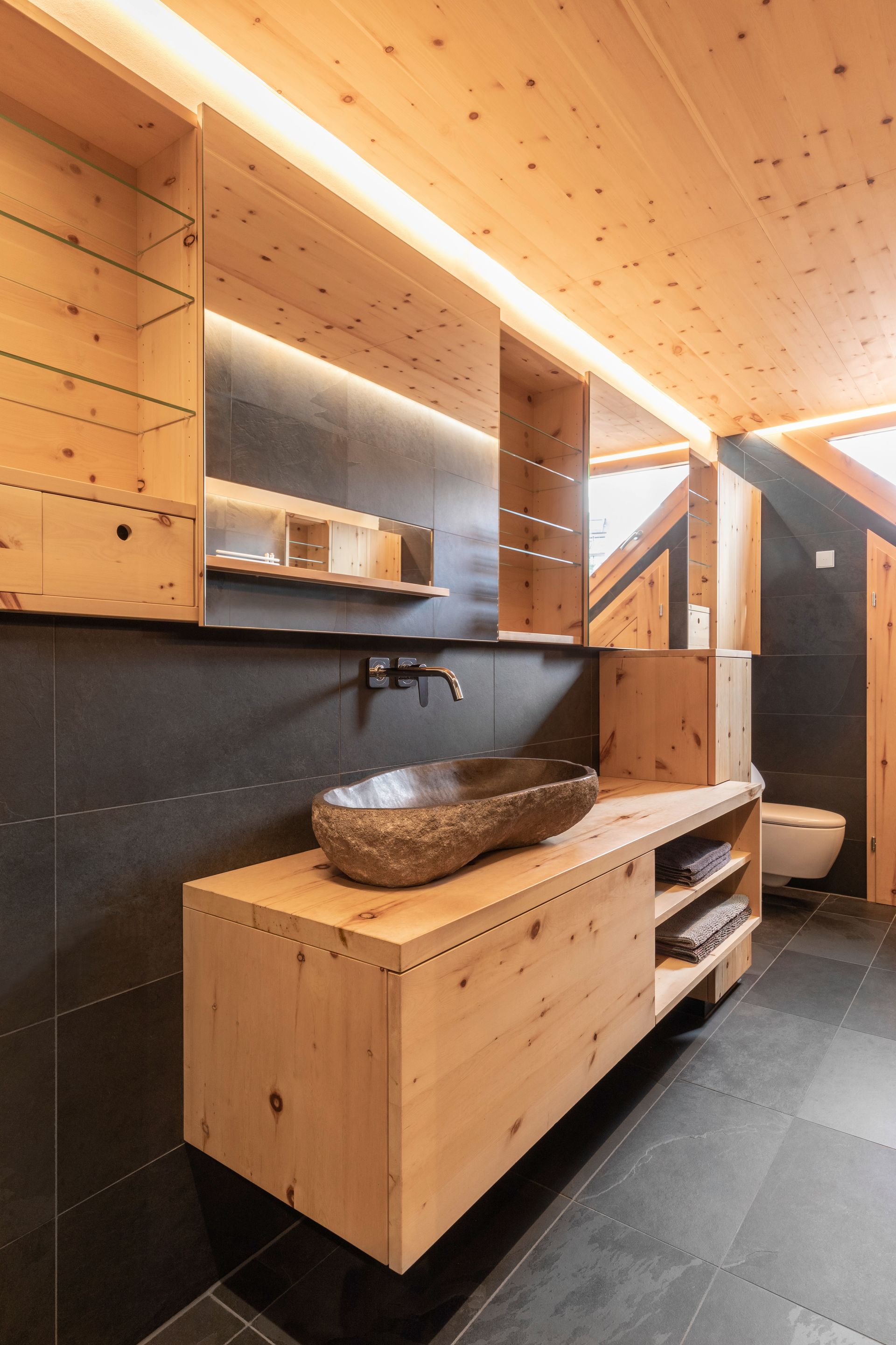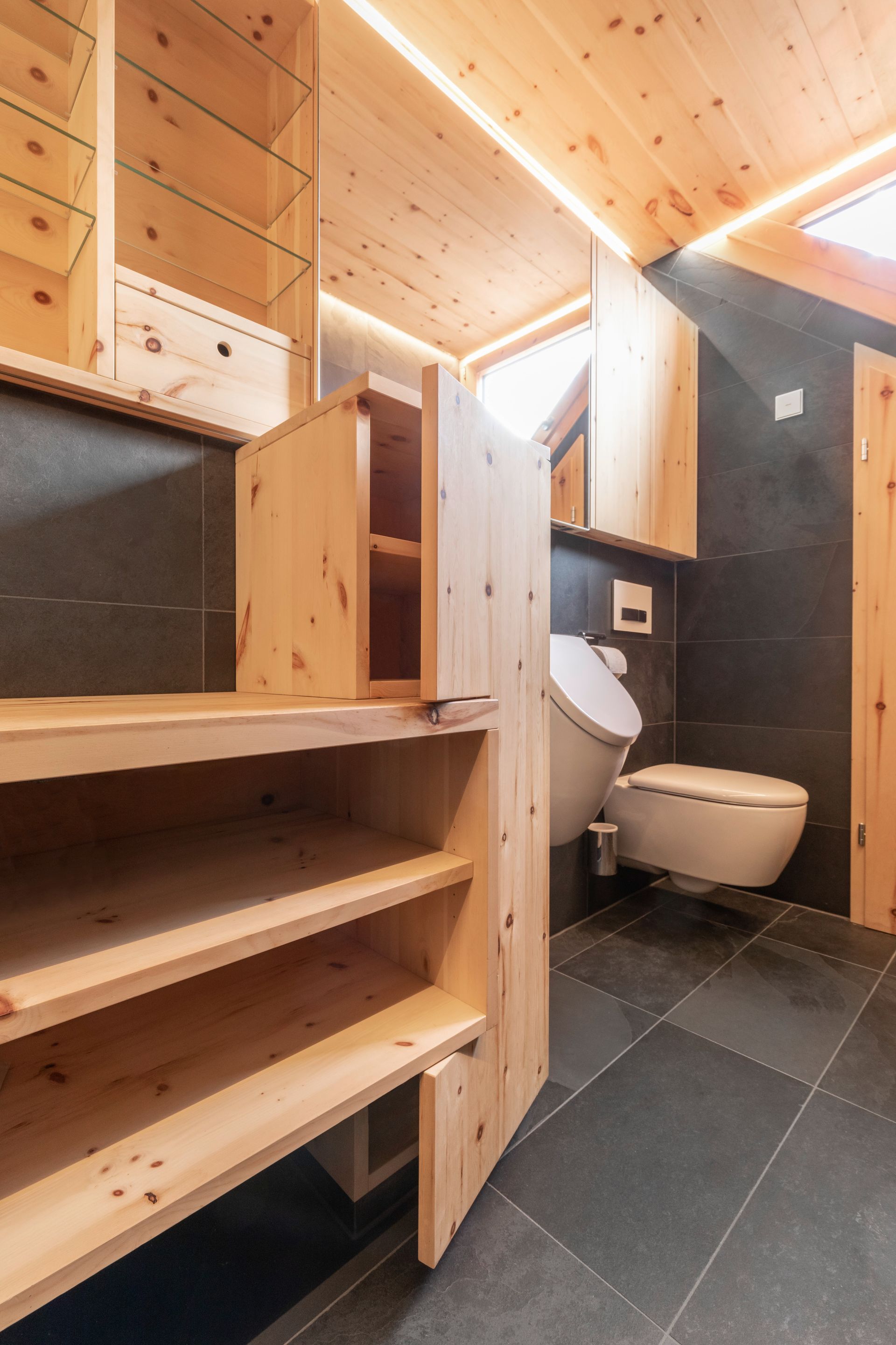 Es beginnt mit der Tür in das WC in Zirbelkiefer, der Boden in Schiefer, die Decke in Zirbelkiefer mit umlaufender LED-Beleuchtung, die Wände in Kombination Zirbelkiefer und Schiefer, das Fenster und die schräge Nebentüre in Zirbelkiefer, der Waschtisch in Zirbelkiefer mit flächiger Schiebetüre übergehend in ein Korpus in Korpus verschachtelter Handtuchschrank in Zirbelkiefer, der Spiegelschrank in Zirbelkiefer. Die Rückseite der Waschtischwand ebenfalls Schiefer mit flächigem Wandspiegel mit Zirbelkiefer-Ablage und integrierter Bildhängeschiene.