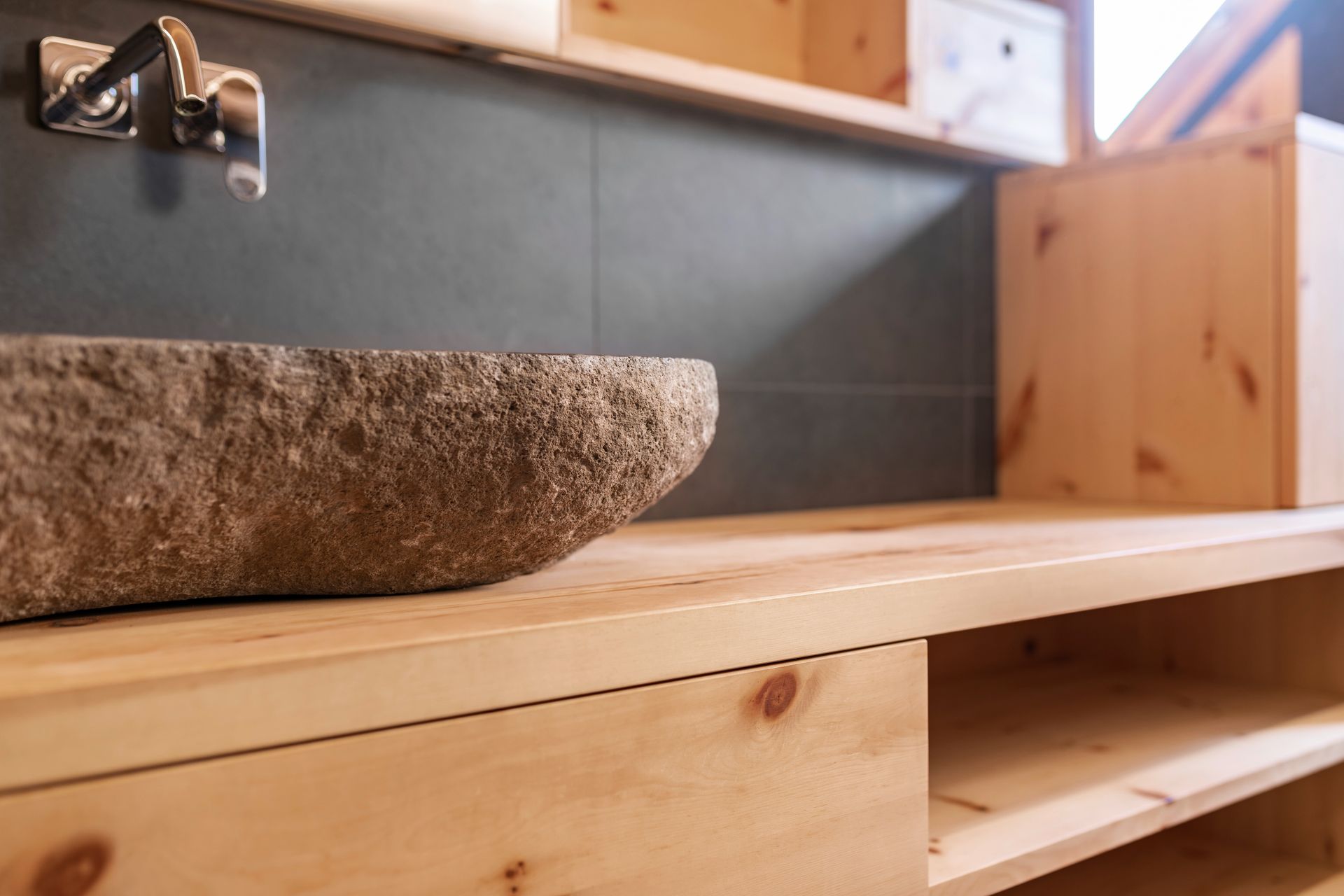Badmöbel in Massivholz Zirbe in Kombination mit echtem Schiefer