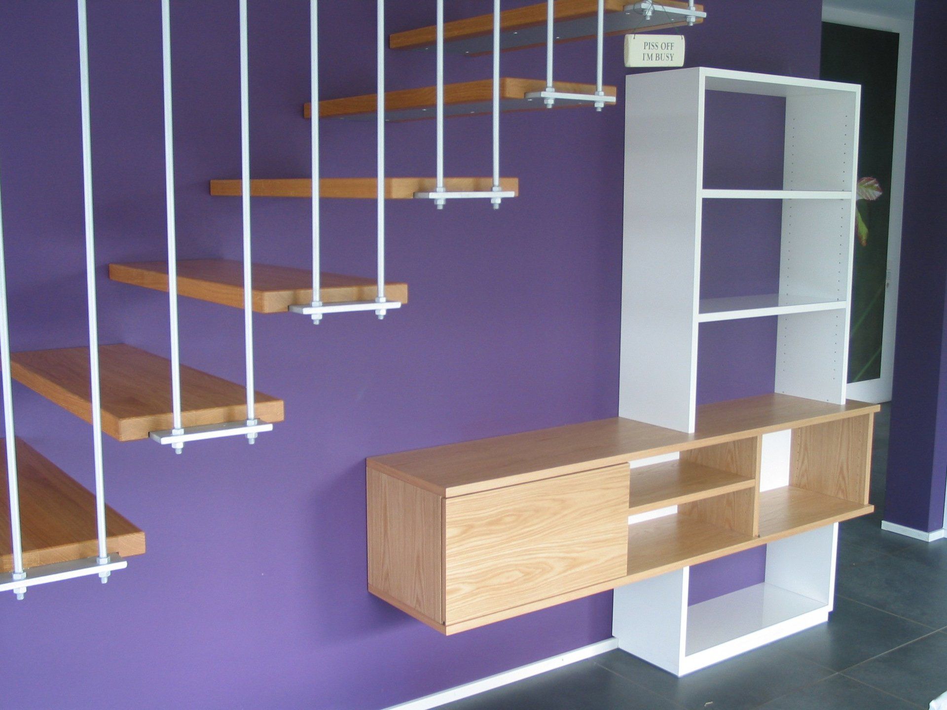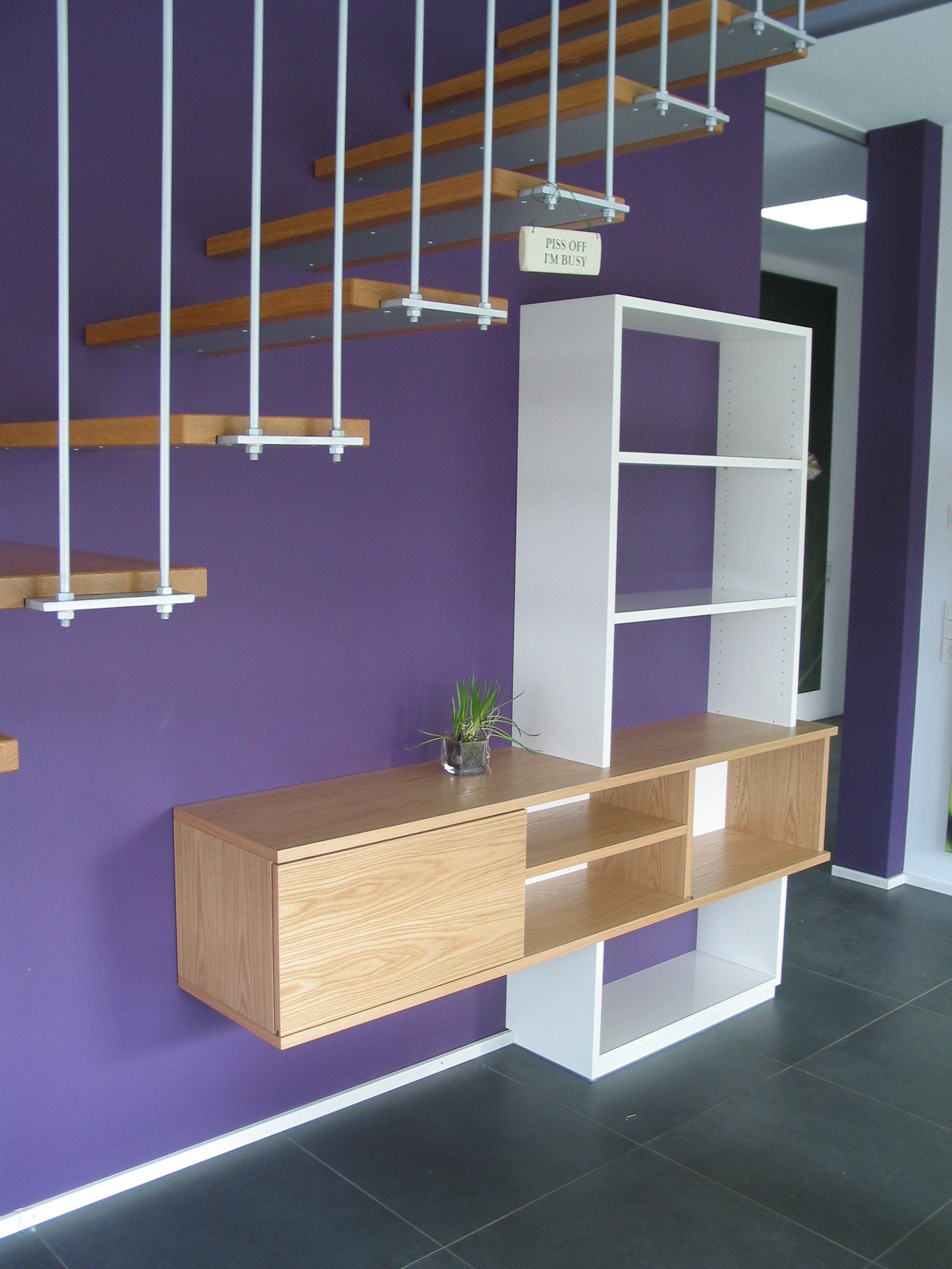 Board in schlichter Eiche furniert mit einer Schiebetüre, Offenes Regalelement in MDF-Platten weiß matt lackiert.