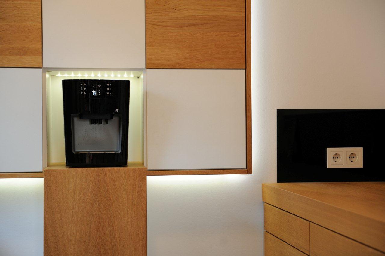 Die 100Mm dicke Arbeitsplatte und die fortlaufend passende Holzauswahl der Schubaldenfronten, lassen die Küchenzeilen wie zwei querliegende Baumstämme wirken. Das teilweise in die Wandfläche integrierte Hängeregal mit der schachbrettmusterartigen Frontgestaltung eingefasst in einem dezenten Holzrahmen der zusätzlich durch ein umlaufendes LED-Band betont wird - hat schon fast was von einem Wandgemälde. Der explizite L-Vorbau in Eiche aus dem Hängeschrank, würdigt in besonderem Maße die "Bedeutung" der Kaffeemaschine.