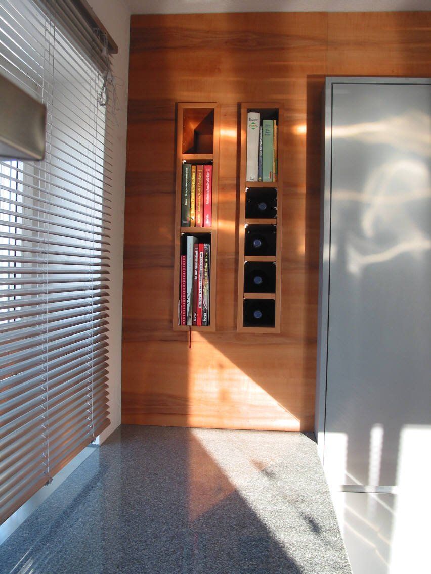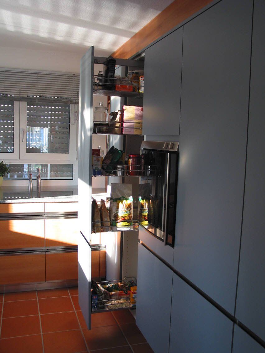 Küchenzeile mit vollausziehbaren Schubladen, durchgängig querliegendes Furnierbild in Schweizer Birnbaum mit eigens angefertigten Edelstahlgriffleisten. Im gegenüberliegenden Küchenschrank ist der Backofen, diverse Apothekerauszüge und viel "Stauraumfläche" untergebracht. Das integrierte Nischenregal nutzt den ansonsten "toten" Stauraum noch auf charmante Weise.