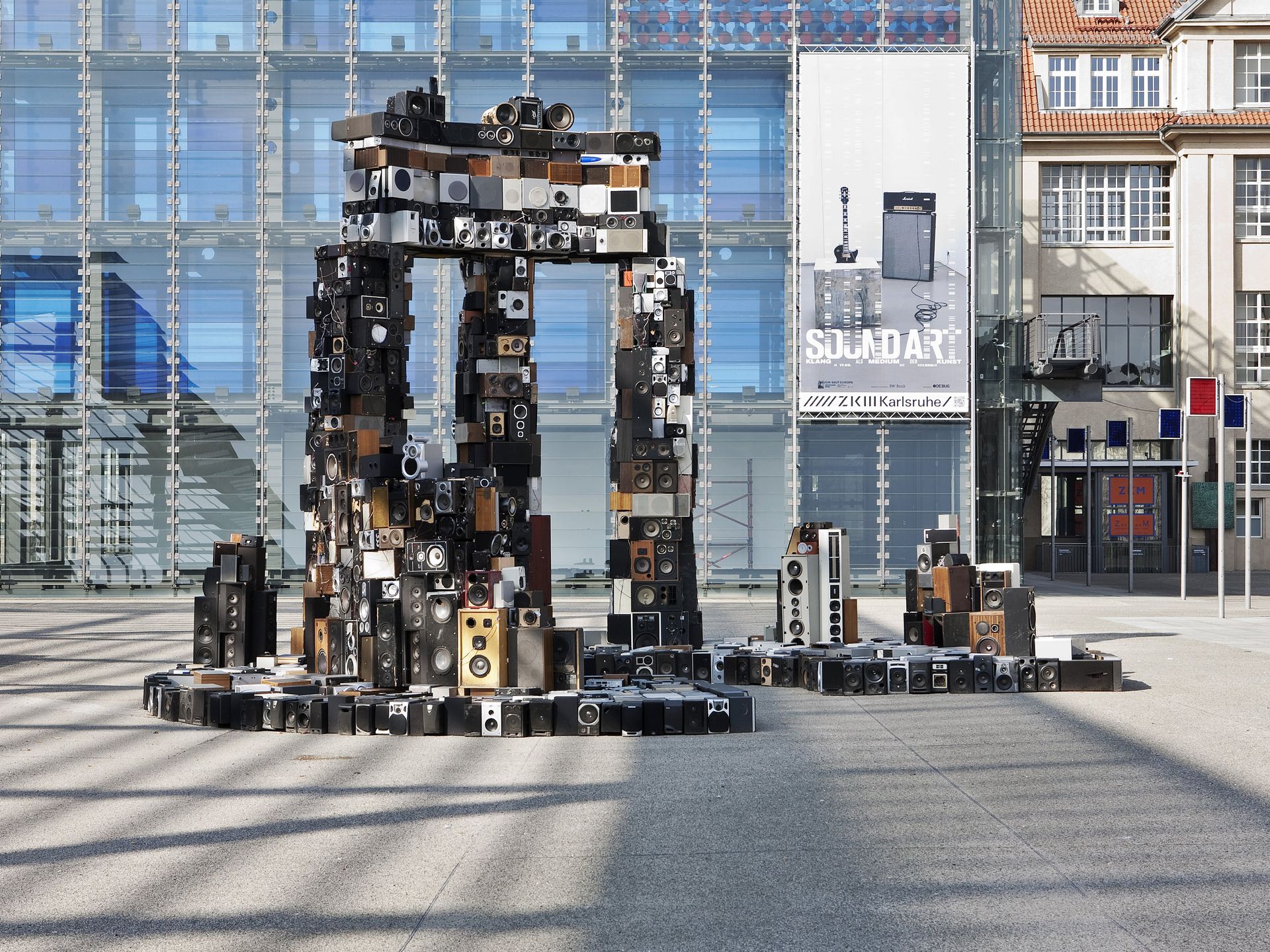 Klangskulptur auf dem ZKM-Vorplatz 3000 gebrauchte Lautsprecher und ausgewählte elektronische Bauteile, 10 gebrauchte Verstärker, 10 gebrauchte Radios/Tuner. In Zusammenarbeit mit der Fa. Pollux wurde hier die Grundkonstruktion für die Lautsprecherinstallation im Freien ausgeführt. "Nachgebildet" wurde der giechische Temple von Delphi.