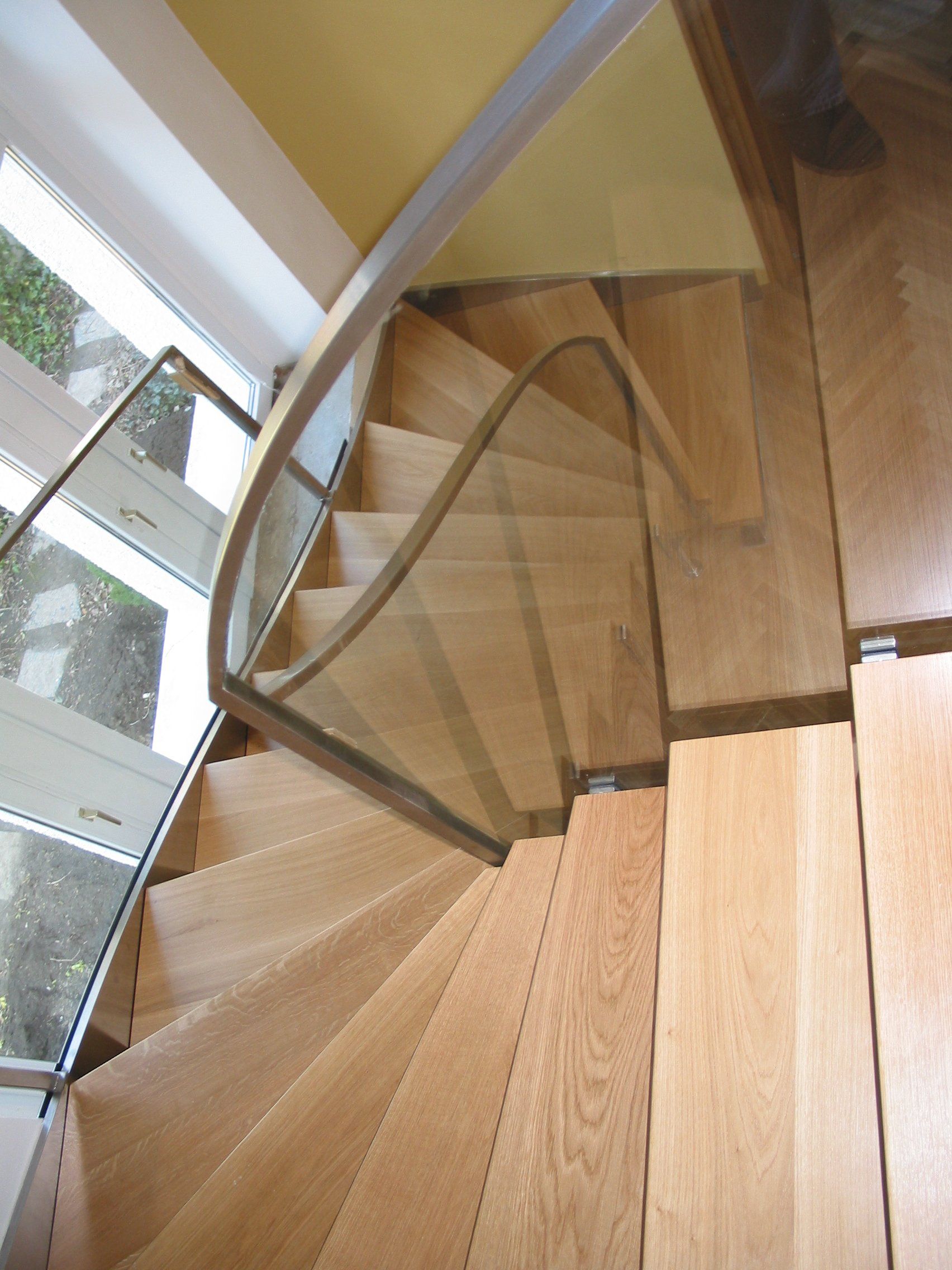 Edelstahl mit Laserteilen, Oberfläche Feinschliff, Brüstung und Geländer aus Sicherheitsglas, - Trittstufen in Eiche Massivholz.